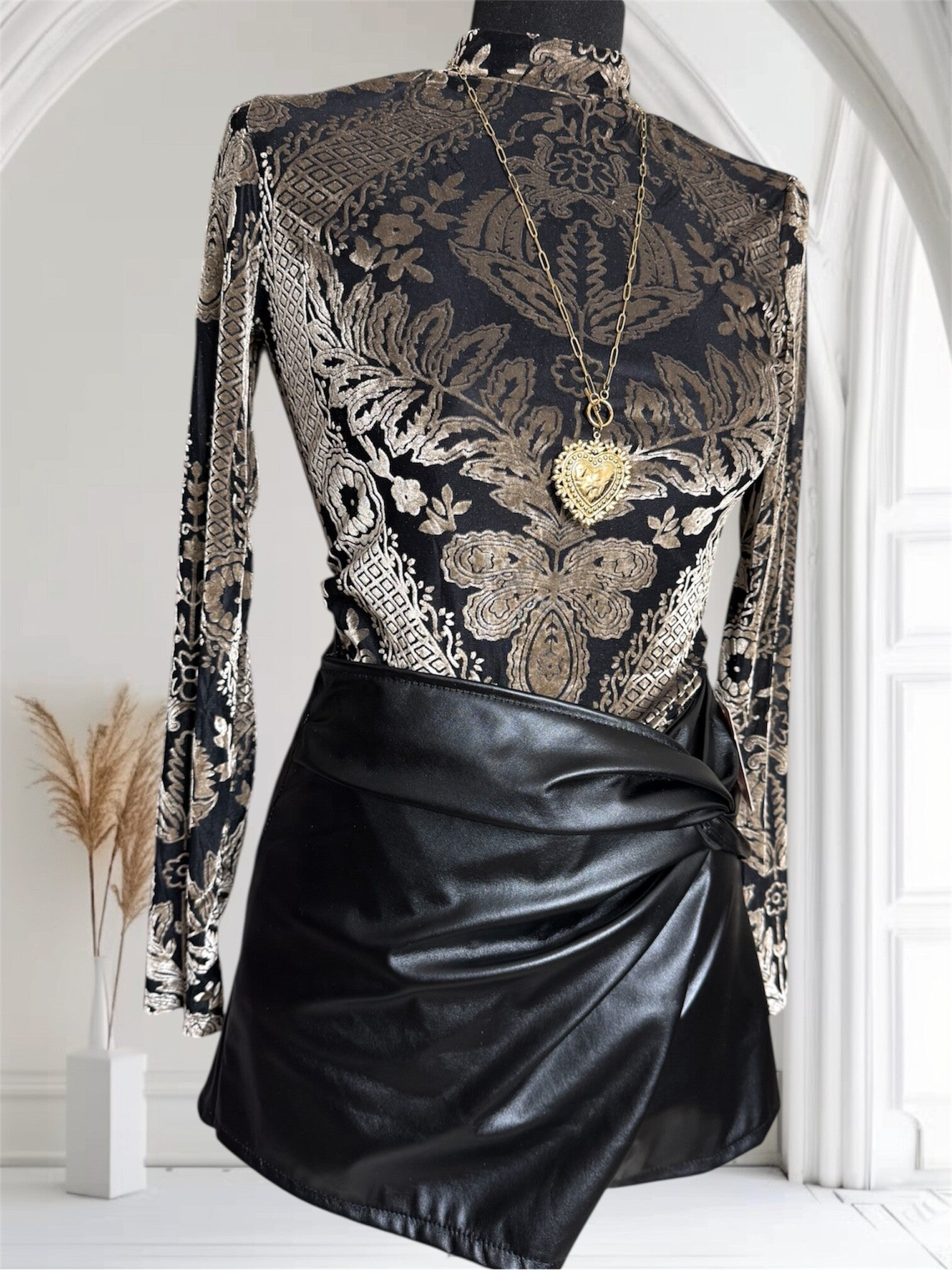 Maak je look edgy en stijlvol met deze *zwarte faux leather short met overslag-effect*. De glanzende leather-look en elegante plooidetail geven een vrouwelijke touch met een stoere twist.