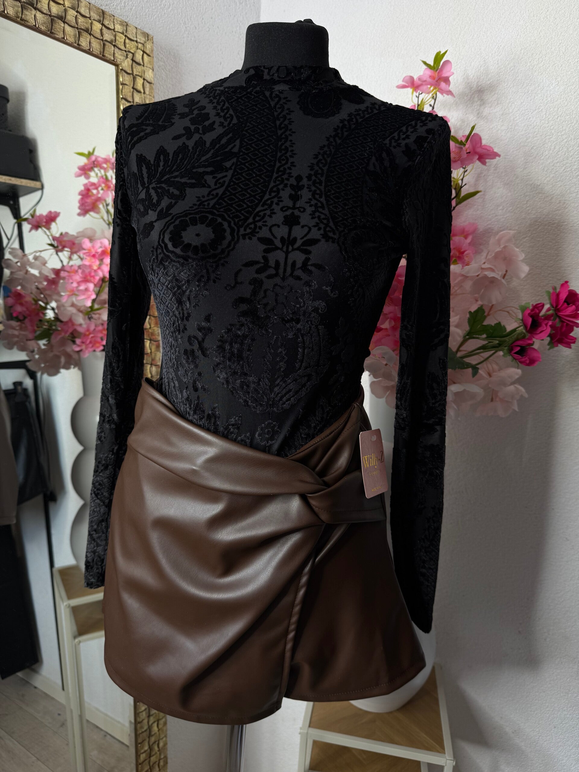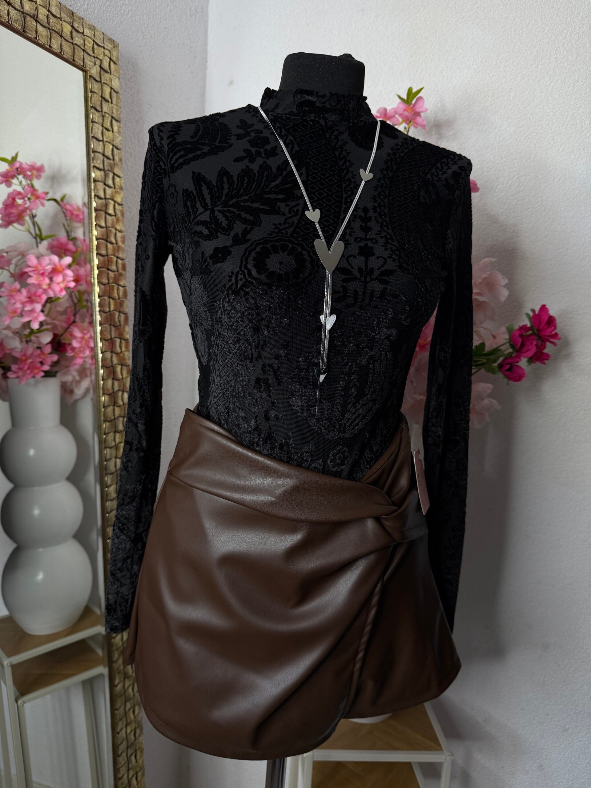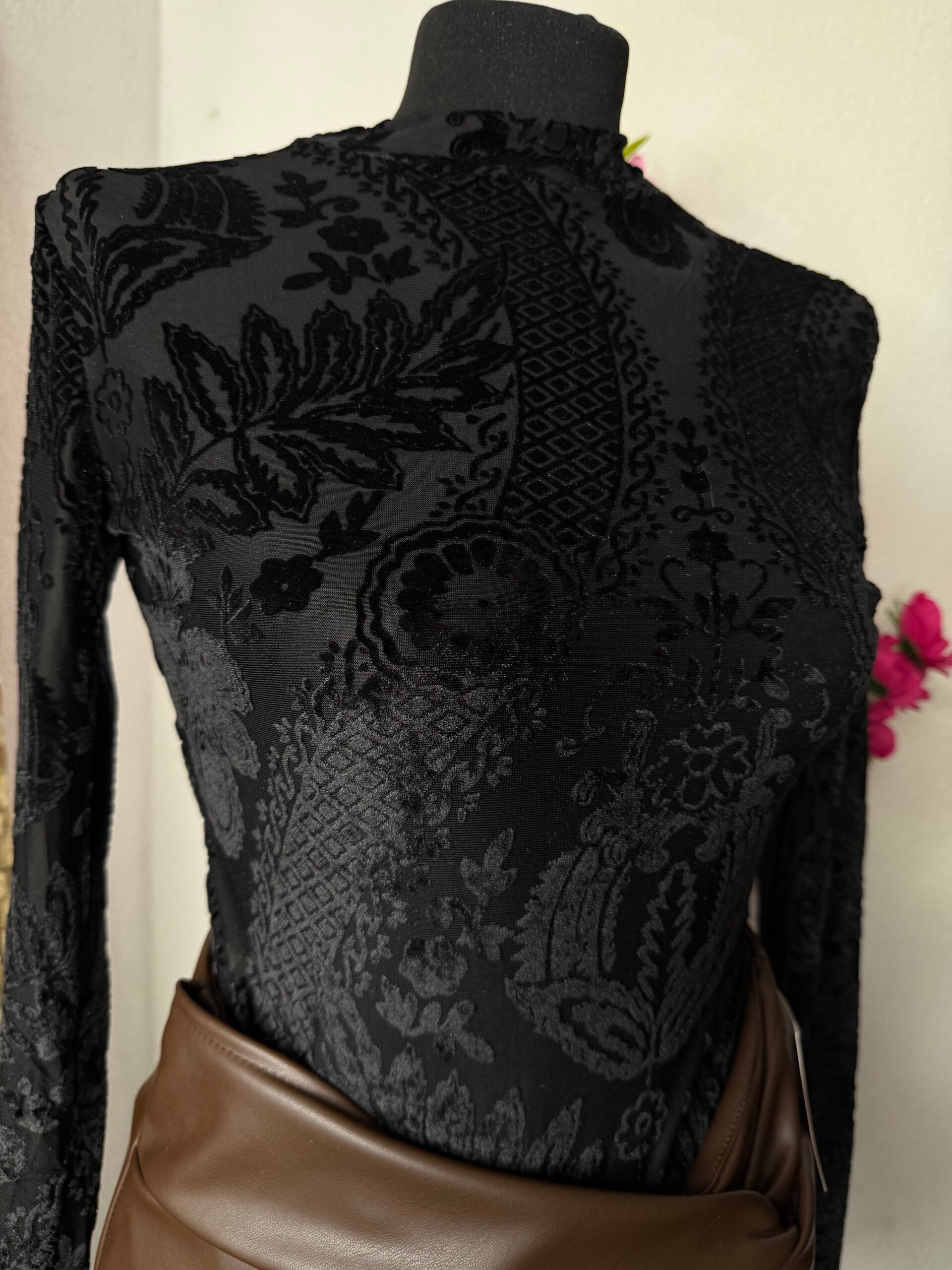 Laat je verleiden door de luxe uitstraling van deze *chique body met barok fluwelen print*. De elegante hoge hals, lange mouwen en de rijke goud-zwarte patronen geven een stijlvolle en krachtige uitstraling.