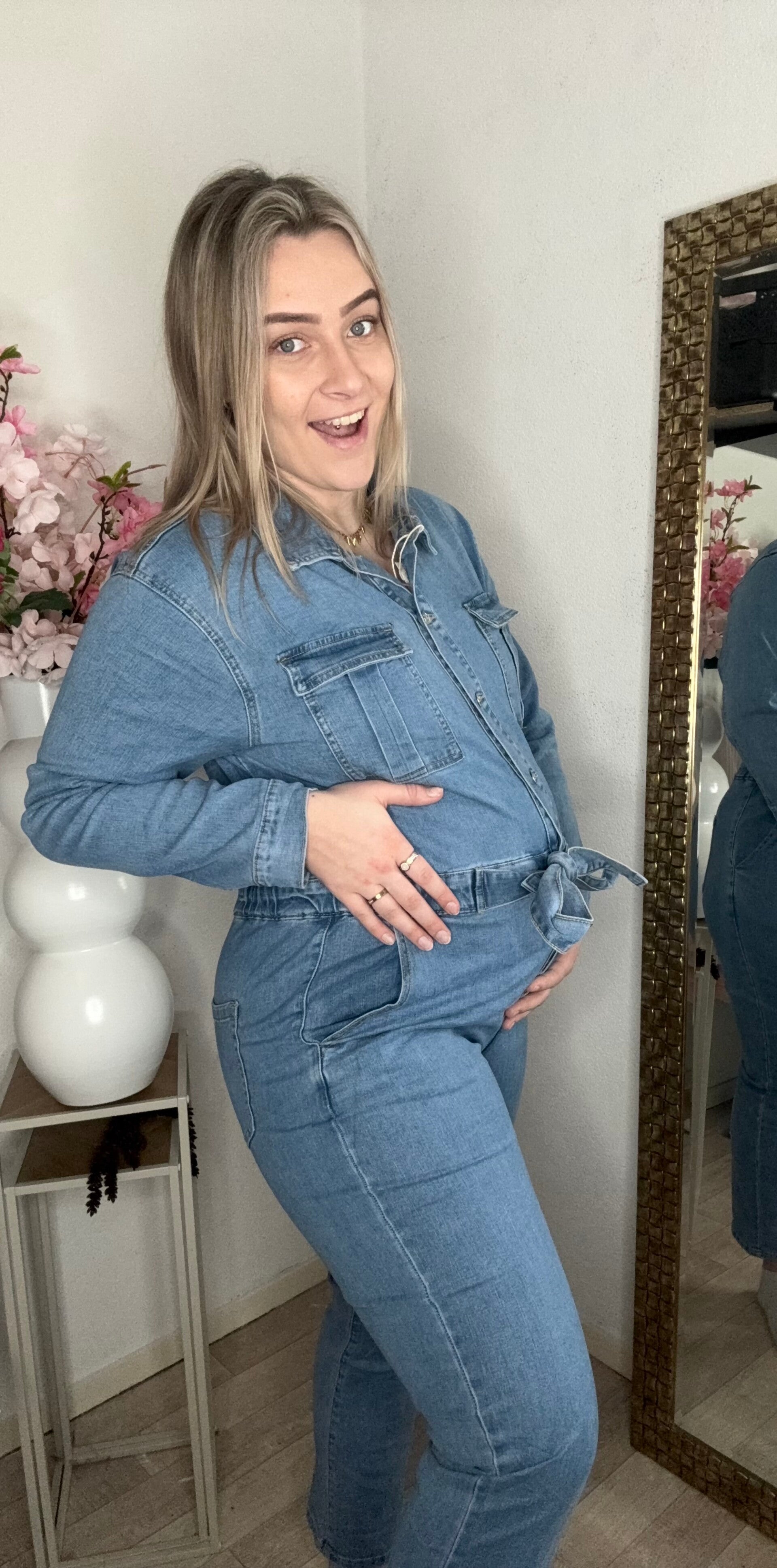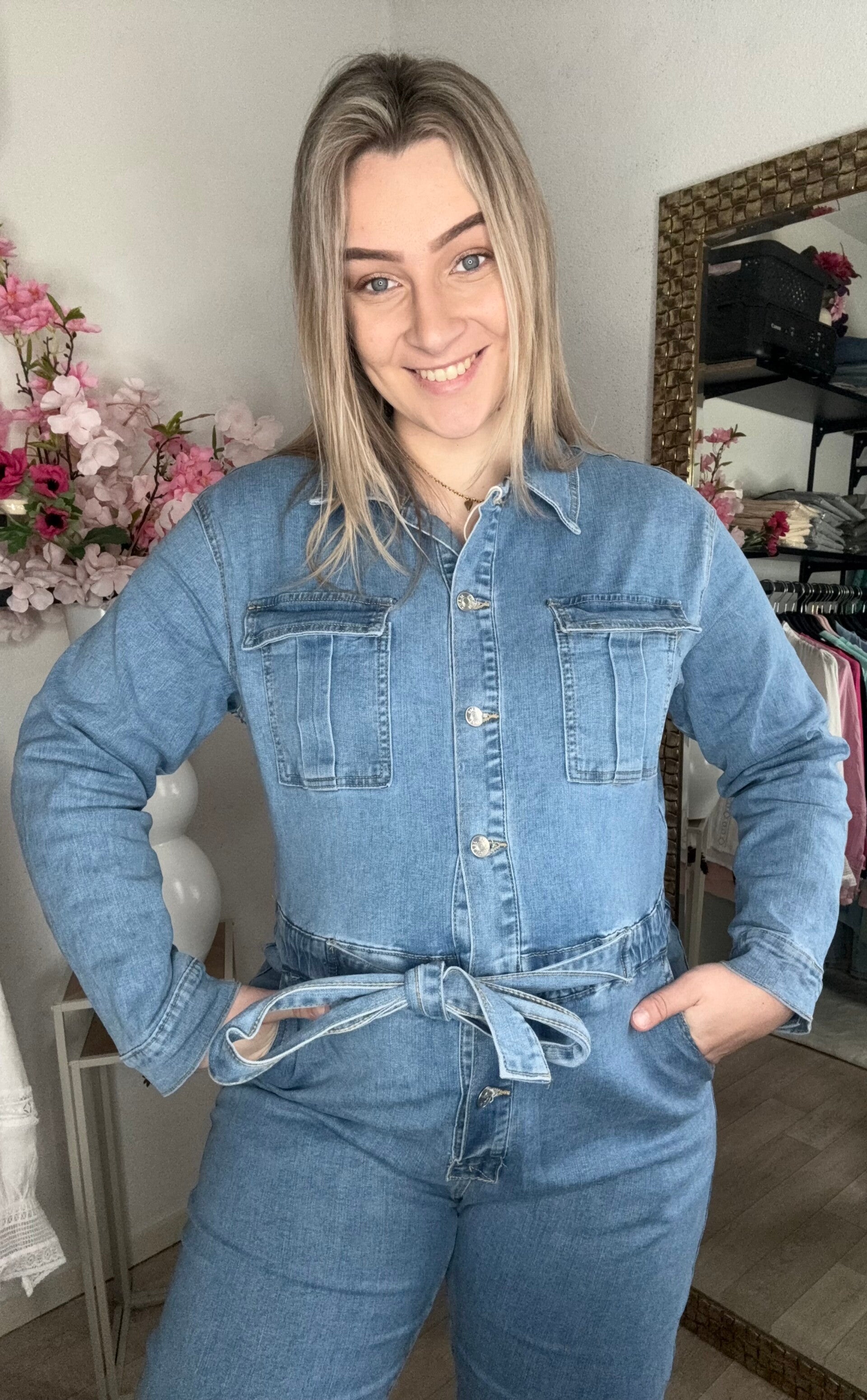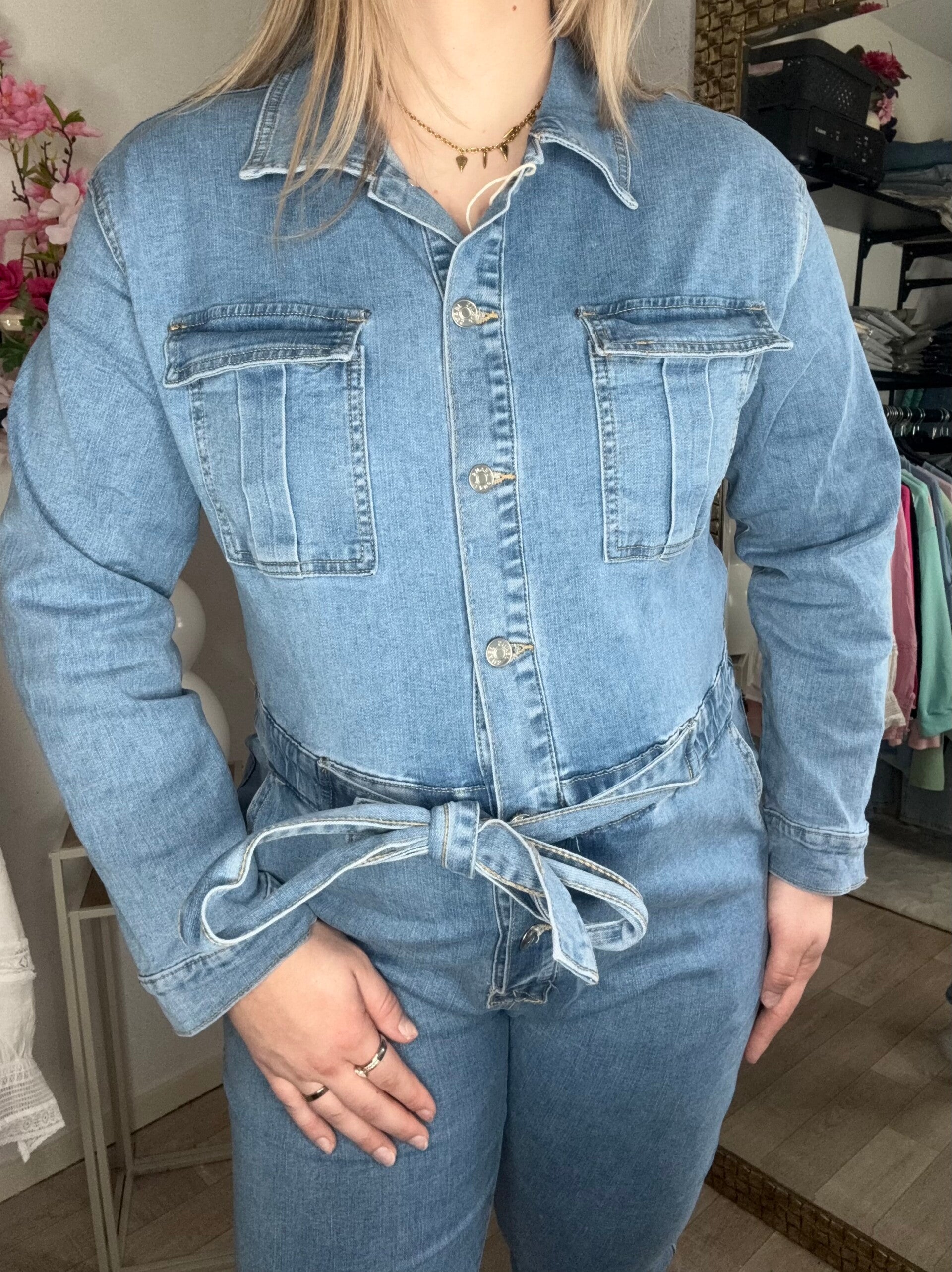 Stijlvolle blauwe jumpsuit met bijpassende riem en rechte snit. Perfect voor de lente/zomer, gemaakt van voornamelijk katoen, zeer comfortabel. Ook verkrijgbaar in grote maten.